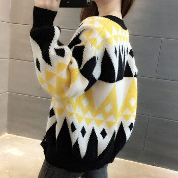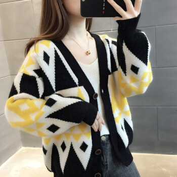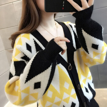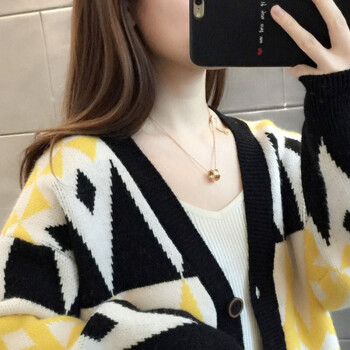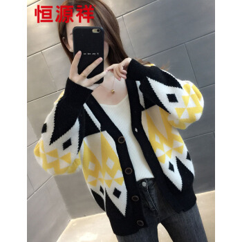 恒源祥针织衫女春秋季新款设计感小众短款菱格开衫毛衣女气质小香风长袖V领上衣女4644 黄色 M |