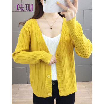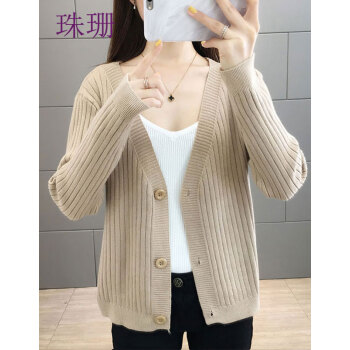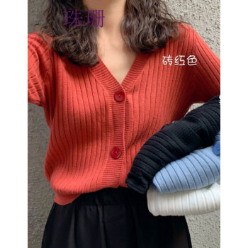珠珊针织衫女新款春秋外搭毛衣小开衫外套女宽松懒慵风V领女装单排扣短款针织衫上衣 7306-砖红色 XL |