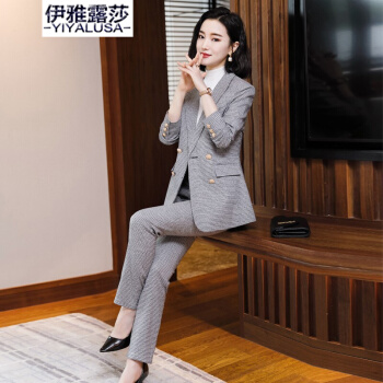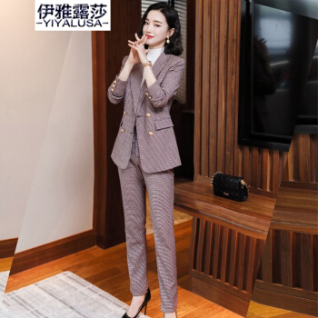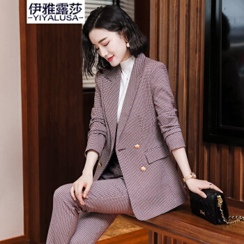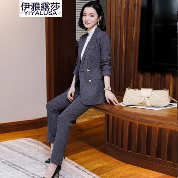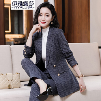 伊雅露莎职业装女装套装小西装女秋季新款时尚休闲外套名媛通勤西服套裤2081 单件蓝格西装 S |