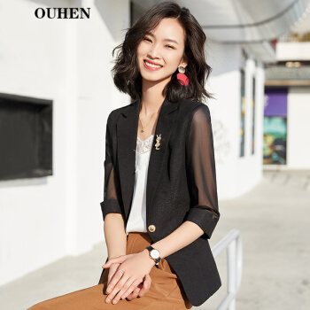 OUHEN轻奢品牌女装小西装外套女夏季新款薄款白色七分袖韩版休闲网纱拼接西服女上衣 白色中袖西装 L(建议96-105斤) |
