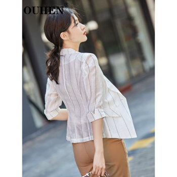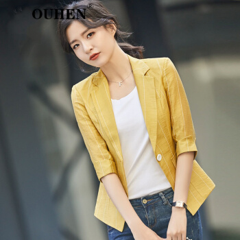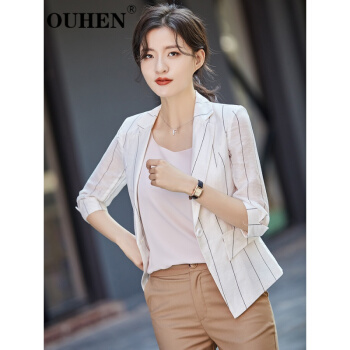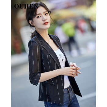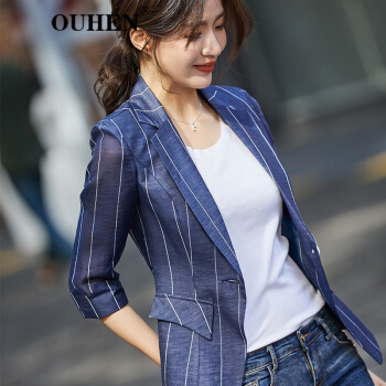 OUHEN高端品牌女装 亚麻小西装外套女新款夏薄款休闲小个子韩版条纹西服上衣 蓝色 M |