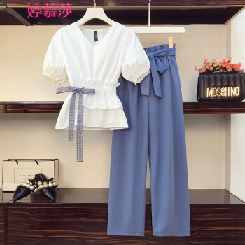 婷慕莎加肥加大码女装显瘦遮肚套装胖妹妹夏装胖女人显瘦款微胖mm200斤时尚洋气胖子女装阔腿裤两件套 套装 大码XXXL |