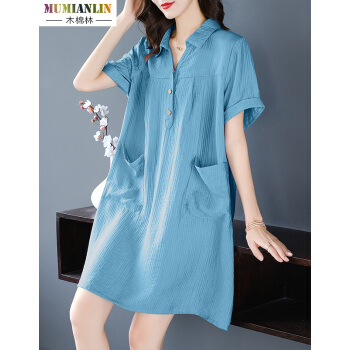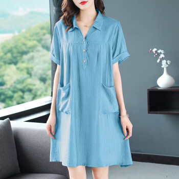 木棉林胖妹妹mm优雅连衣裙加大码女装新款夏装洋气减龄翻领宽松遮肚子中长款裙子女H202586 蓝色 XL建议120-140斤 |