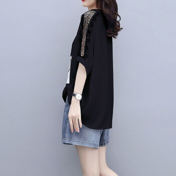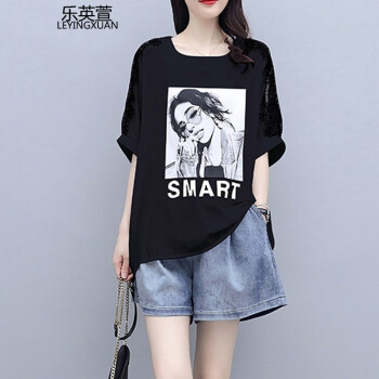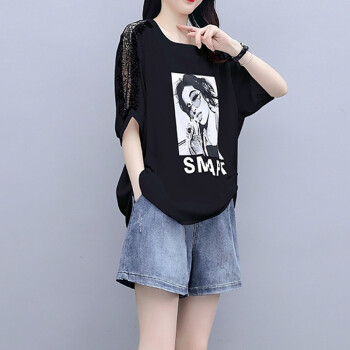 乐英萱大码女装套装胖妹妹夏装新款胖人女装显瘦款加肥加大码微胖mm遮肚子宽松T恤+牛仔短裤套装 黑色 M建议90-100斤左右 |