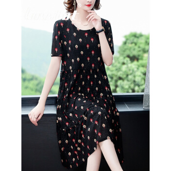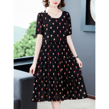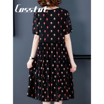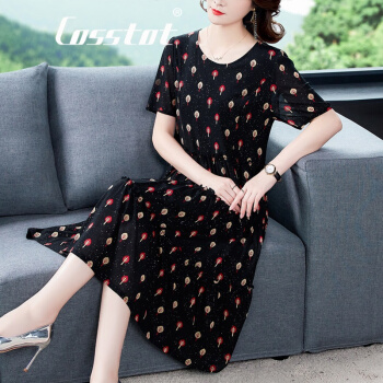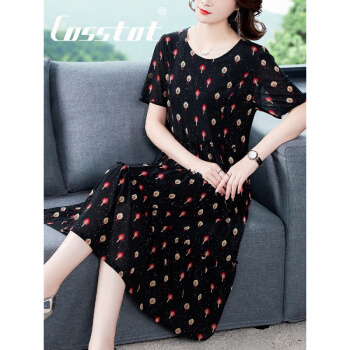 Cosstot轻奢品牌女装 大码高端连衣裙新款夏季中年妈妈贵夫人名媛气质遮肚裙子 黑色小树 XL |