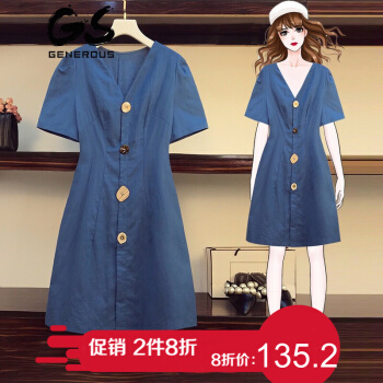 歌诺瑞丝大码女装胖mm连衣裙夏装新款文艺宽松显瘦休闲气质减龄韩版遮肚子V领中长款裙子 蓝色 XL 推荐120-140斤 |