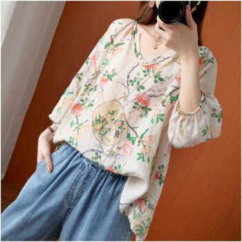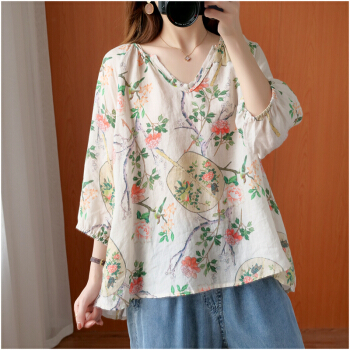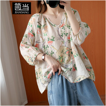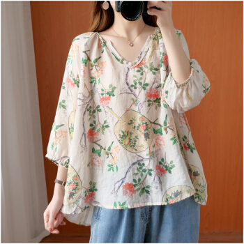 简当新款夏装加大码女装胖妹妹MM棉麻短袖宽松上衣单件上衣衬衫防晒衣T恤ZRK3061 花色 大码均码 |