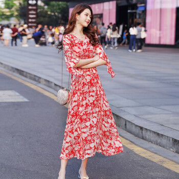 若玲珑网红碎花雪纺连衣裙新款夏收腰显瘦荷叶边气质小清新甜美超仙长裙 红花 M(建议90-105斤) |