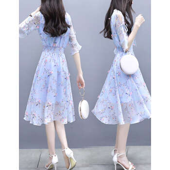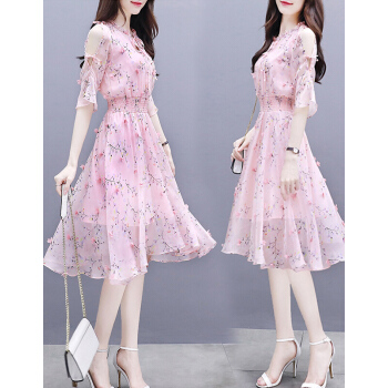 欧芙伦碎花雪纺连衣裙女夏季新款韩版时尚气质显瘦减龄收腰中长款裙子女5935 粉色 M |