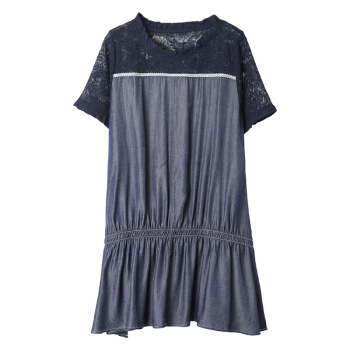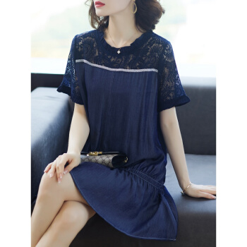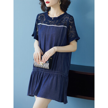 红粉宣言夏季新款百搭宽松蕾丝连衣裙显瘦短袖拼接裙子 蓝色 L |