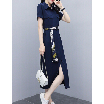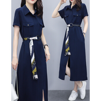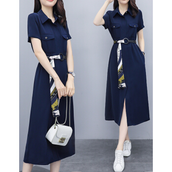 莱倪晟纳短袖连衣裙女装夏装新款韩版修身气质系带高腰显瘦开叉减龄中长裙潮 藏青色 请拍正确尺码 |