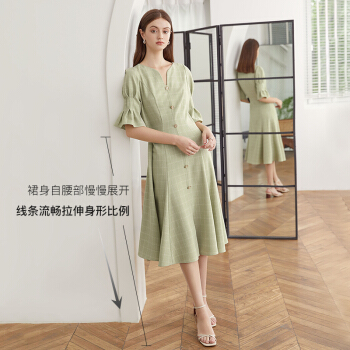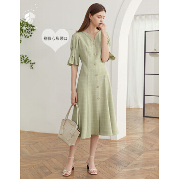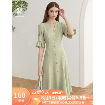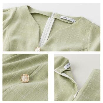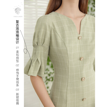 范思蓝恩 夏新款泡泡袖V领格子连衣裙女天法式复古约会小裙子 绿白格 S |