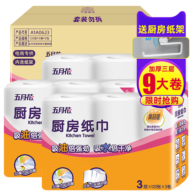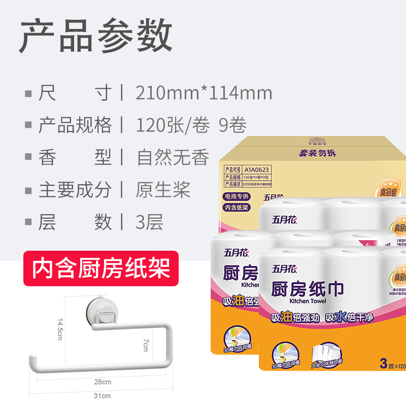 五月花含纸架厨房卷纸3层120节9大卷 |