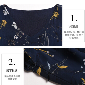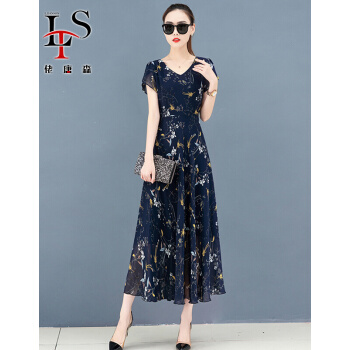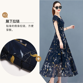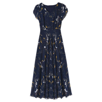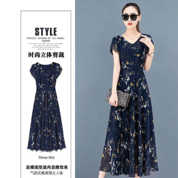 佬唐森印花雪纺连衣裙夏季新款碎花长裙大码女装遮肉显瘦减龄裙子 蓝底水仙花 请拍正确尺码 |