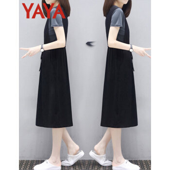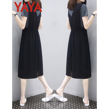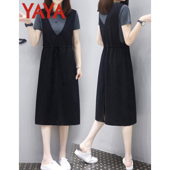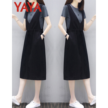 鸭鸭服饰(yaya)休闲连衣裙女女装夏季新款流行韩版收腰显瘦两件套中长款T恤裙 灰T+黑裙 请选择正确尺码 |