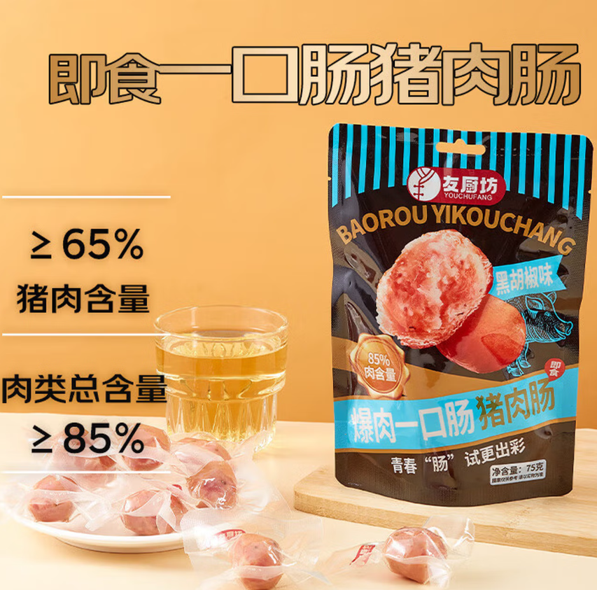 友厨坊一口肠猪肉肠(黑胡椒味)75克 充饥火腿烤肠零食开袋即食火腿肠 |