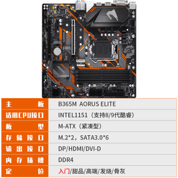 技嘉(GIGABYTE)B365 M AORUS ELITE “小雕” 电竞游戏主板 支持WIN7支持9400F(Intel B365/LGA 1151) |